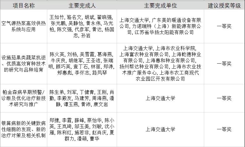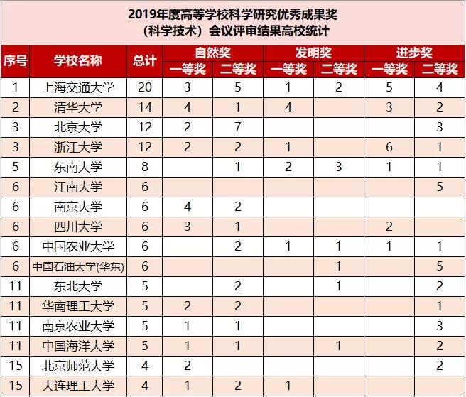 从总数来看,上海交通大学表现出色,评审通过的项目共计20项,位列第一位,其中一等奖9项,包括自然科学奖3项,技术发明奖1项,科学技术进步奖5项。